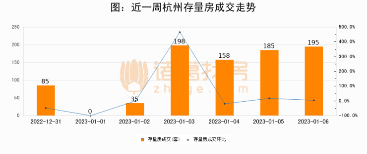 从存量房来看,2023年01月06日杭州存量房单日成交195套,比昨日增加10套,环比上涨5.4%。从近一周存量房成交来看,杭州存量房日均成交套数为122套,其中01月03日成交量最高为198套,01月06日单日成交195套,高于近一周平均水平59.8%。