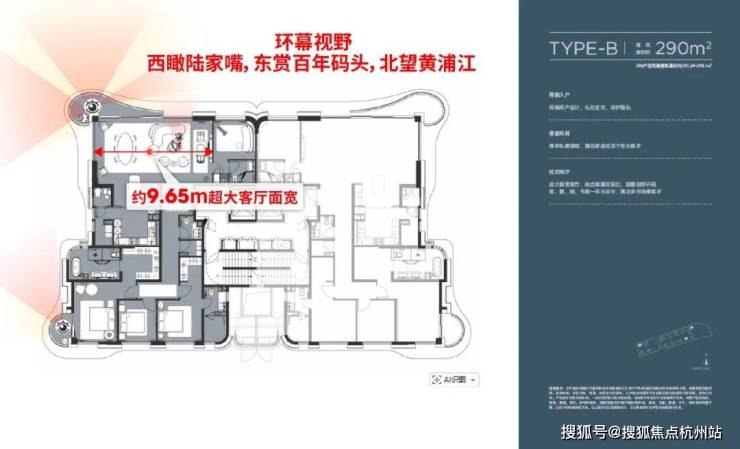 再加上两梯两户、约9.65米客厅面宽、约3.5米层高、蝶翼双阳台、餐客厨书房一体化等配置……约290㎡户型不再只是一个大户型,而是一套真正有辨识度、有项目代表性的滨江作品。