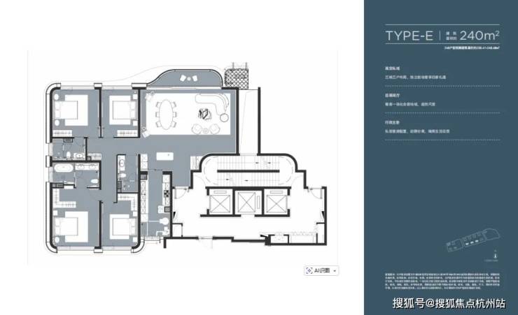 建面约240㎡户型,中低区总价约3500-4000万。如果说约180㎡户型解决的是“占位”,那约240㎡户型解决的,就是真正舒舒服服住进去。这一档很像五批次里的“隐形优等生”。它未必最有话题度,但很可能是最稳的一档。因为它几乎踩中了高净值家庭最现实、也最长期的居住需求: