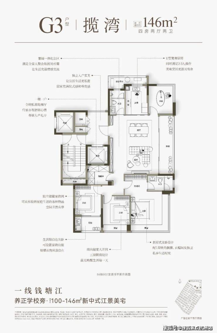 云启钱湾高层分为4种类型,建面约100㎡和建面约121㎡户型,做了创新S墙设计,提高了空间利用率,对年轻家庭来说,也是非常友好的。建面约146㎡四房户型,全部南向面江,大部分楼层还可看到一线江景。