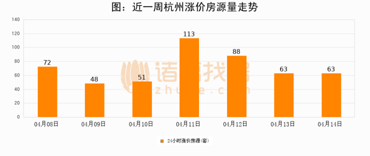 根据诸葛找房数据显示,杭州24小时涨价房源量为63套,较04月13日持平。