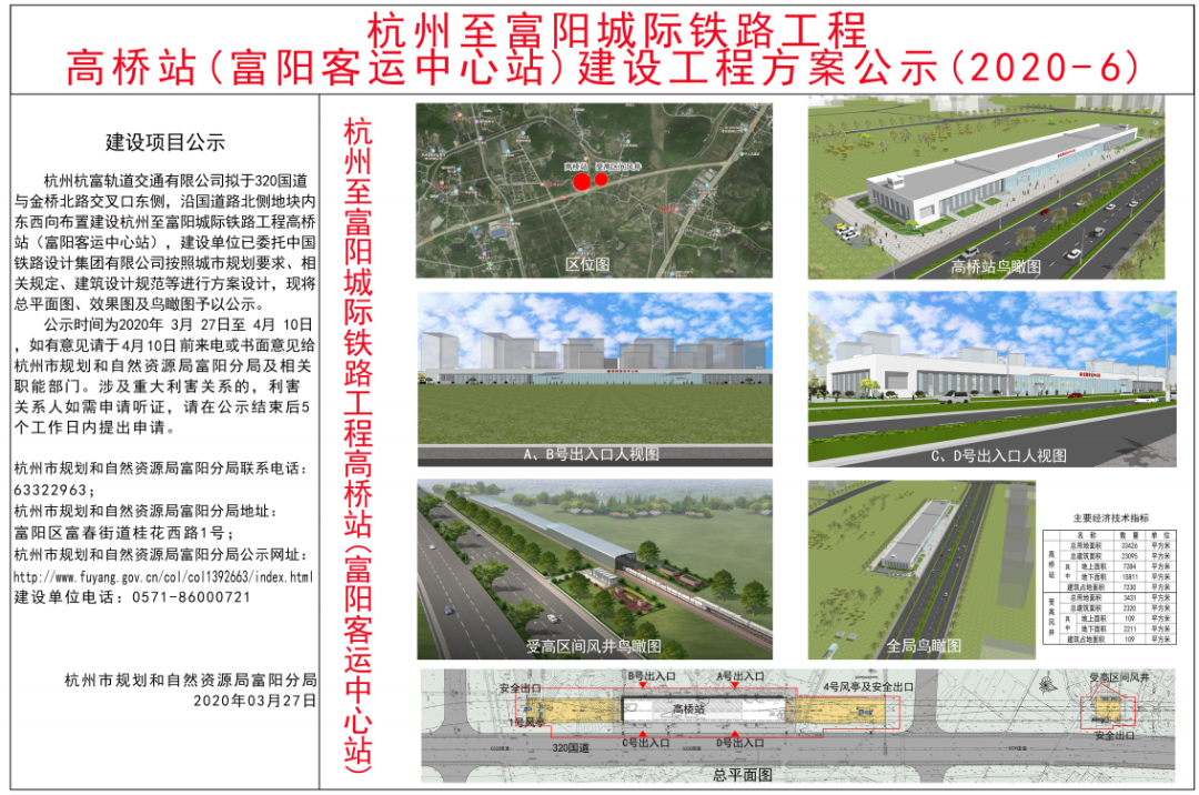 来源:富阳日报 杭富地铁又有新消息! 高桥站(富阳客运中心站) 建设工程方案 于3月27日起公示 快来看看你家门口 以后的地铁站“长”啥样~ ↓↓↓ 高桥站 (富阳客运中心站) △区位图 △总平面图 △高桥站鸟瞰图 △受高区间风井鸟瞰图 △全局鸟瞰图 站点位于G320国道路北侧,规划设有A、B、C、