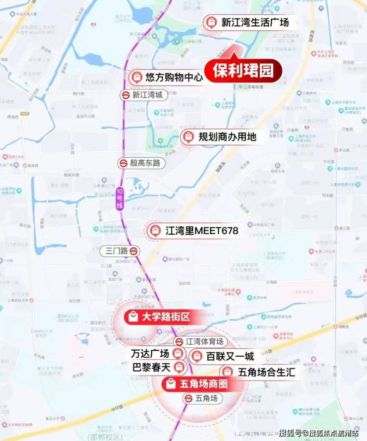 项目周边汇聚五大商业体,距离项目200m就是新江湾生活广场,约1km就是悠方购物广场,约2km是江湾里MEET678,约3km是大学路街区,3站地铁就可以直达五角场商圈:合生汇、万达广场、百联,可以满足日常所需,实现了居住与通勤的平衡。