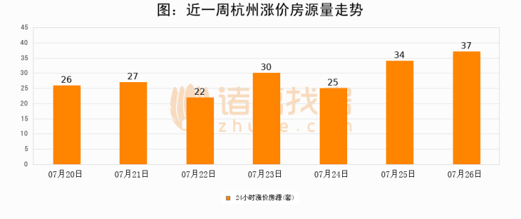 根据诸葛找房数据显示,杭州24小时涨价房源量为37套,较07月25日增加3套,环比上涨8.8%。与此同时,涨价房源占比小幅扩大,业主信心有所提升。