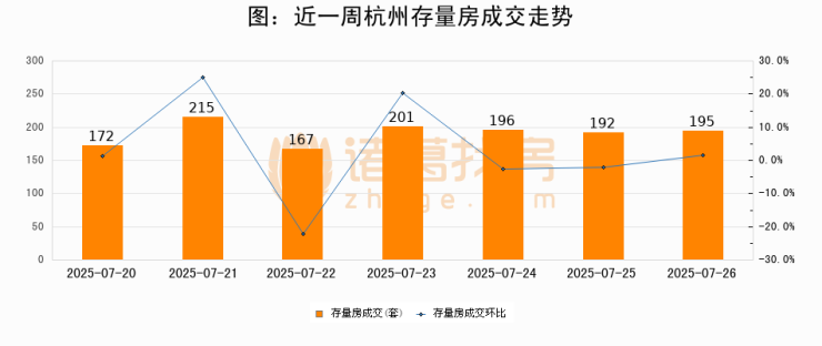 从存量房来看,2025年07月26日杭州存量房单日成交195套,比昨日增加3套,环比上涨1.6%。从近一周存量房成交来看,杭州存量房日均成交套数为191套,07月26日单日成交195套,高于近一周平均水平2.1%。