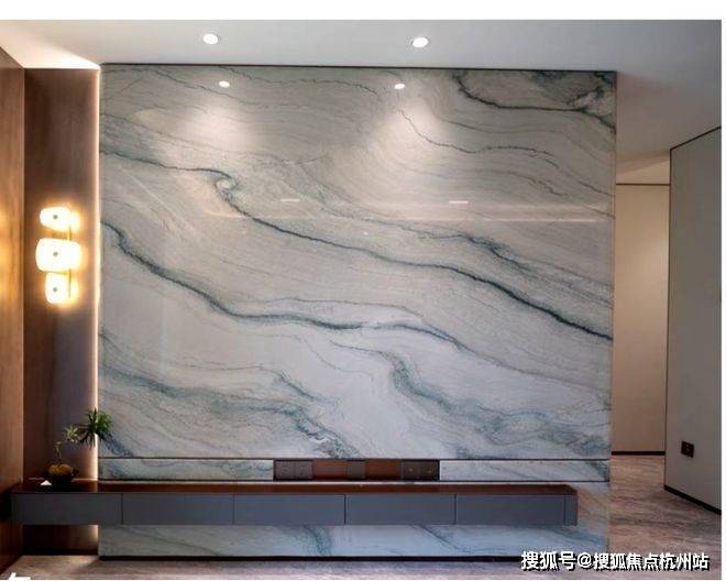 电视背景墙选用带有东方意蕴的万里河山石材,颜值超高! 保利海上瑧悦售楼处电话:400-998-9694(现场到访预约)