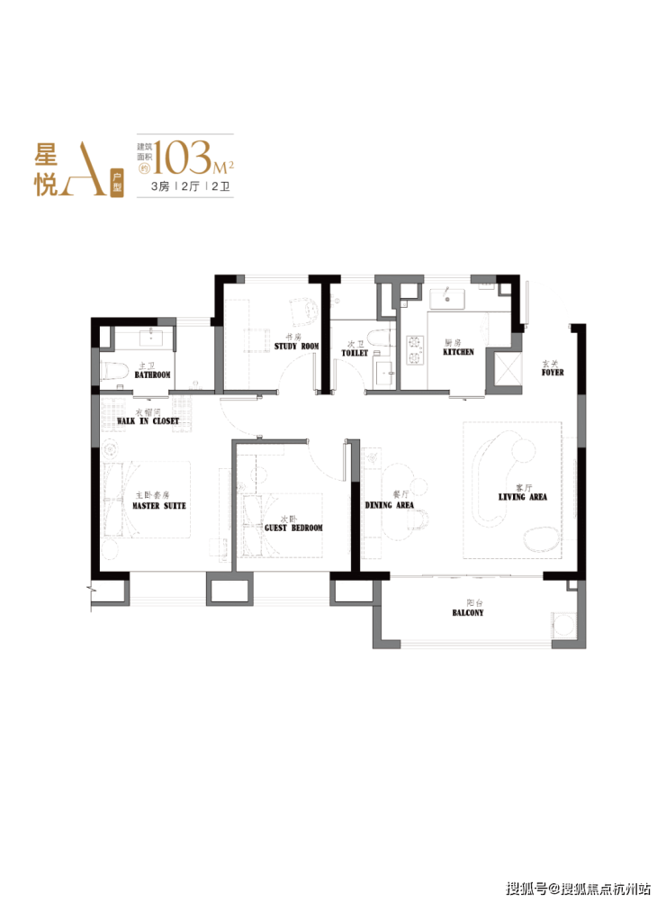项目约103-107㎡3房2卫设计,有着宽绰的大横厅设计,并且3.5开间朝南。