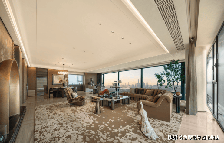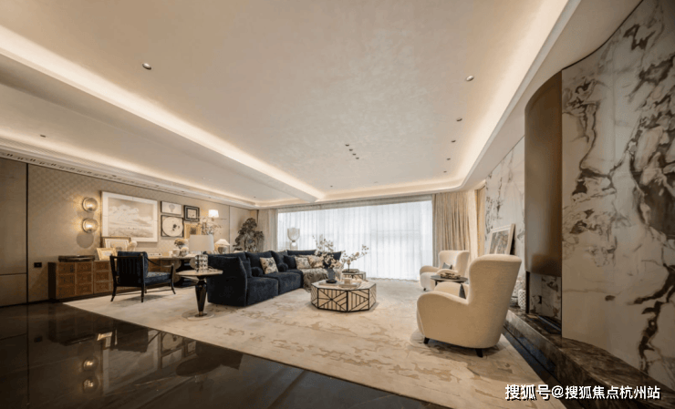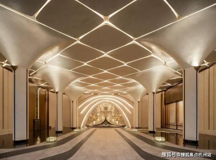 光之序厅:7米挑高,意大利木纹洞石墙面,艺术吊灯营造东方雅韵