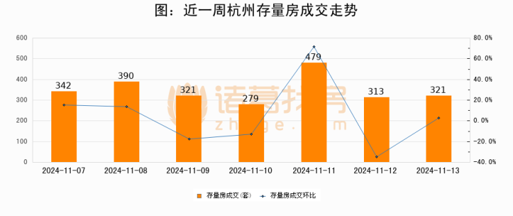 从存量房来看,2024年11月13日杭州存量房单日成交321套,比昨日增加8套,环比上涨2.6%。从近一周存量房成交来看,杭州存量房日均成交套数为349套,11月13日单日成交321套,低于近一周平均水平8%。