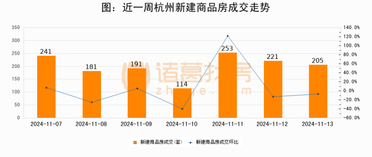 根据杭州市住房保障和房产管理局数据显示,2024年11月13日杭州新建商品房成交205套,较昨日减少16套,环比下降7.2%