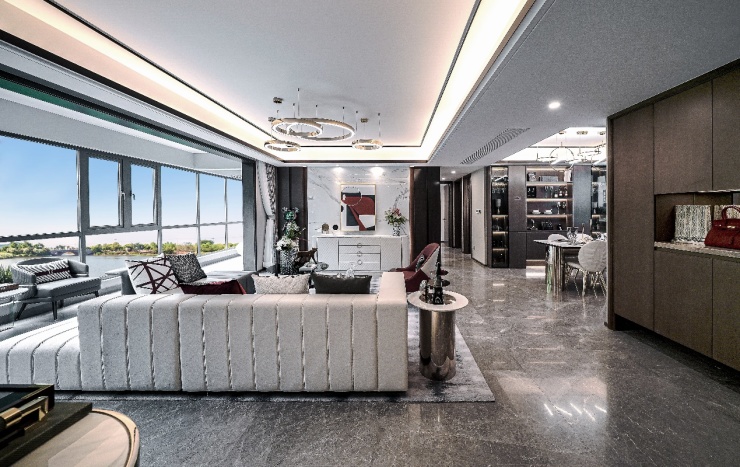进门就是餐客厅一体化设计,连着跑道式的阳台,让生活一下子“豁然开朗”。阳光通过全明落地窗铺洒一地,俯瞰下去,一面是潺潺流淌的水系,另一面则是繁华天街的璀璨,这样的生活,值得毕生珍藏。