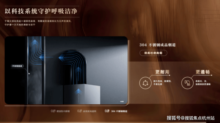 ◎衡洁:清鲜如一的全域呼吸。摒弃传统水泥烟道,升级304不锈钢烟道系统,从结构上消除回烟与异味困扰;搭配多重滤网新风系统,PM2.5过滤效率超98%,让每一次呼吸都清新畅然。