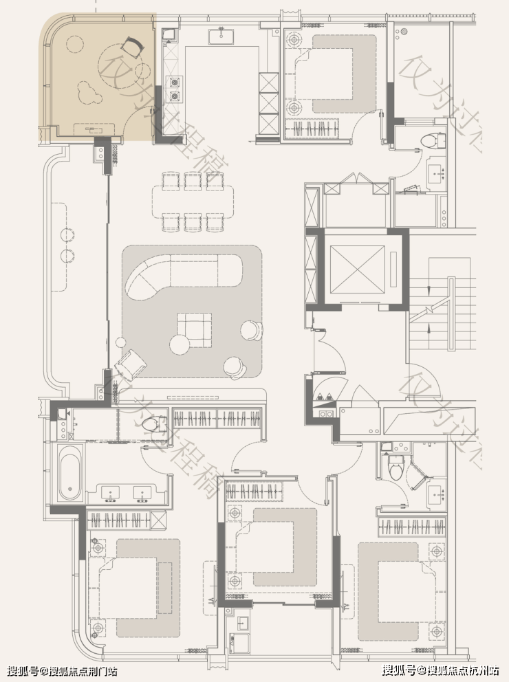 天澜传序府建筑面积约265方的户型,更是直接就做出了大平层,才有的尺度感——