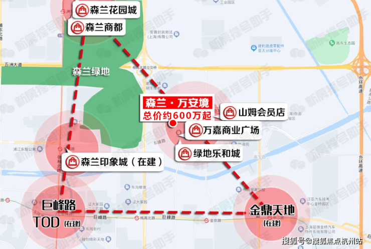 森兰印象城效果图,仅供参考上海新嘉中心Prisma效果图,仅供参考以及现有的森兰花园城、盒马x会员店等,东侧与山姆会员店直线距离约750米(数据来源于百度地图),向南举步即达万嘉商业广场。项目自身还规划了特色商业,繁华生活尽在咫尺。