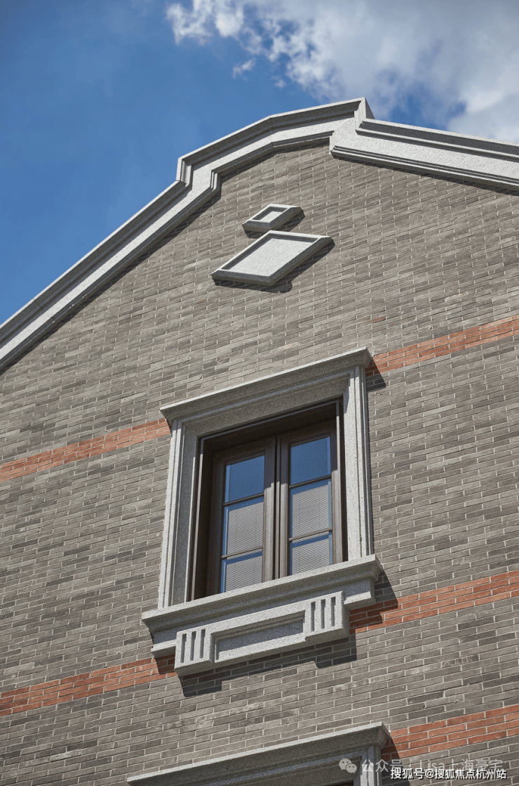 而在与砖连接的窗体,保利永兴里别墅的窗框及四周采用了仿木纹铝型材和铝板,门窗套为浅色石材。