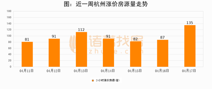 根据诸葛找房数据显示,杭州24小时涨价房源量为135套,较04月16日增加48套,环比上涨55.2%。与此同时,涨价房源占比小幅扩大,业主信心有所提升。