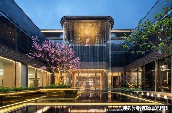 下沉式环幕庭院,跌水景观环绕,池底仿黑金砂与宝石晶片闪烁,点缀百余灯珠,师法“琉璃水光”形意,糅合视听五感,打造全浸式立体园境,天工巧夺,嘉定未见。
