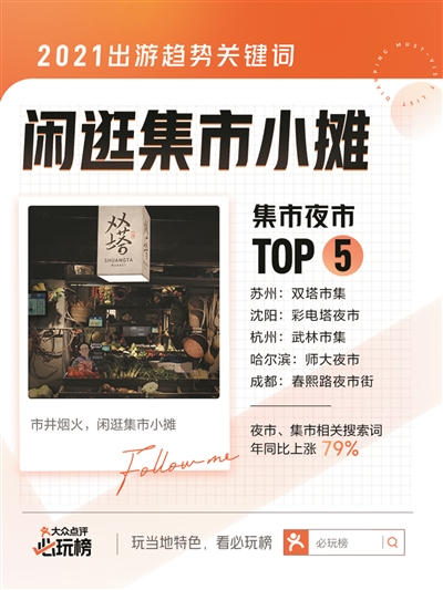 “市井烟火气,最抚凡人心”,夜市、集市拓宽游客游玩半径,为深度探索城市提供了更多可能。大众点评数据显示,夜市、集市相关搜索词年同比上涨79%,杭州的武林市集与苏州的双塔市集、沈阳的彩电塔夜市、哈尔滨的师大夜市、成都的春熙路夜市街入选TOP5热门集市夜市。