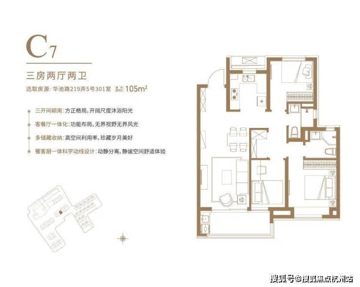 建筑面积约105㎡3房2厅2卫, 。动静分区,各个功能分区动线流畅,家庭成员之间既能良好互动又能各取所需。主卧和次卧都做了飘窗,空间的宽阔感大大提升,采光也更好,同时增加了收纳空间。