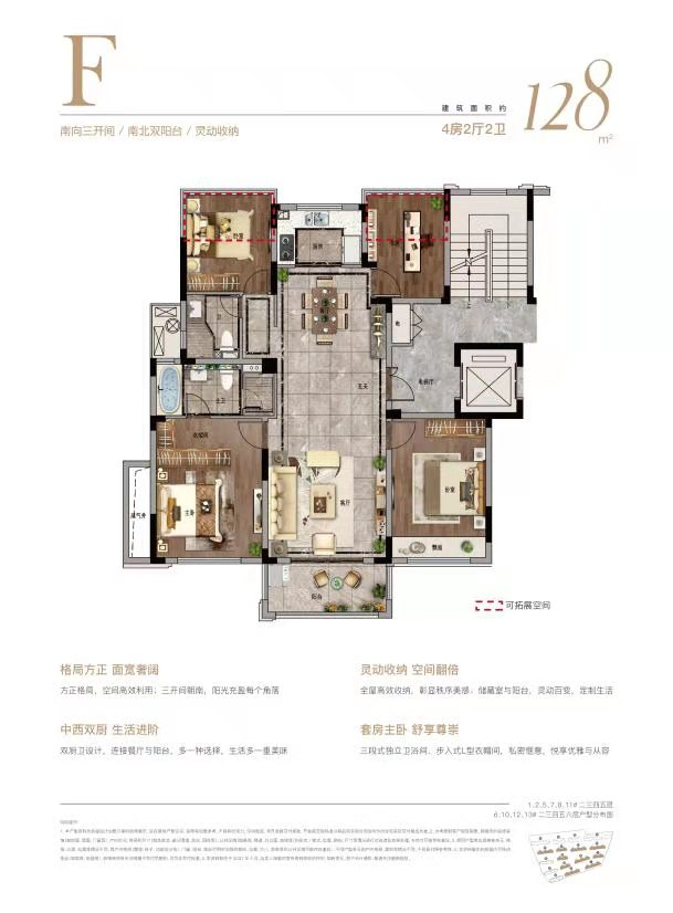 此次首开的主力户型为112-148㎡,毛坯交付,其中128㎡四房户型做了精装样板房。这个户型也还不错,128方做了四叶草格局,四个房间相互独立,互不干扰。