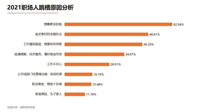 从受访者想跳槽的四大原因是,“想赚更多的钱”“追求更好的发展机会”“工作遇到瓶颈,想要有所突破”“疫情缓解,经济复苏,看好就业市场”,得票率为62.54%、48.61%、45.20%、34.67%。这些数据说明,“这一届职场年轻人,都很现实。”