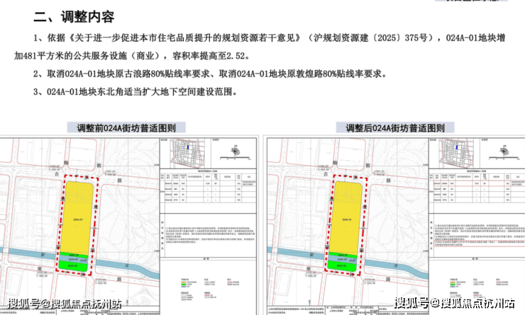 与规划设计方案同步公示的,还有街坊的规划调整;根据规划,024A-01地块内需增加481平米商业配套。这也是上海首次宅地出让之后,再进行深化调整。