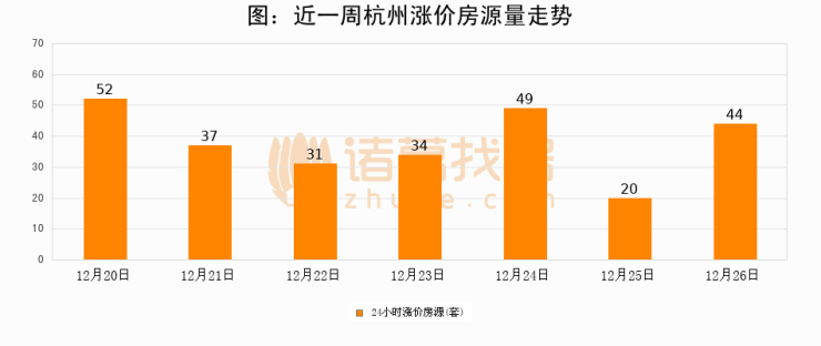 根据诸葛找房数据显示,杭州24小时涨价房源量为44套,较12月25日增加24套,环比上涨120%。与此同时,涨价房源占比小幅扩大,业主信心有所提升。