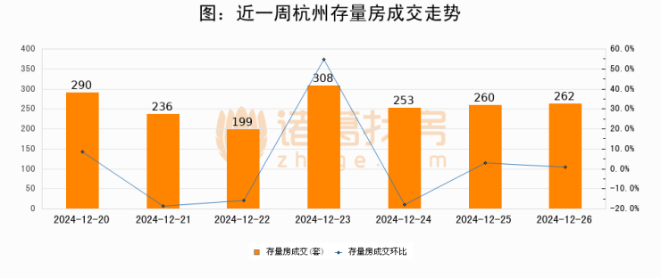 从存量房来看,2024年12月26日杭州存量房单日成交262套,比昨日增加2套,环比上涨0.8%。从近一周存量房成交来看,杭州存量房日均成交套数为258套,12月26日单日成交262套,高于近一周平均水平1.6%。