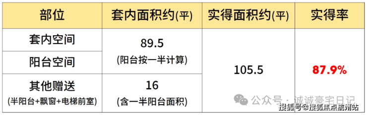 该户型大量的飘窗+双阳台设计,保证了每个功能间的通风采光,也提升了户型的实得率。经过专业建筑师测算,假设阳台全部封闭的情况下,项目建面约120㎡户型实得面积约105.5㎡,实得率约88%。(该实得率数据根据实得面积预估计算所得,仅供参考,不作为置业依据。最终得房率以购房合同为准)