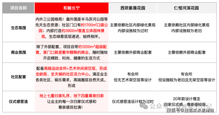 和樾长宁的迭代首先是公区发力,我们可以对比下同板块3个关注度较高小区:和樾长宁、西郊紫薇花园、仁恒河滨花园(最新挂牌价也有12万+)的公区配置。
