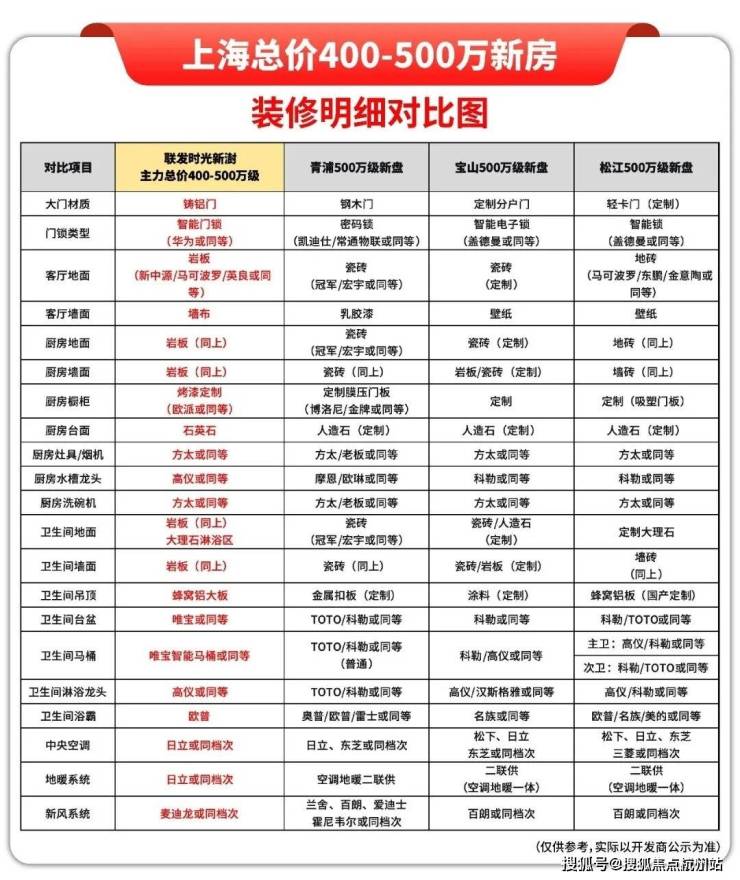 我把各区目前四百万比较热门的新房的装修标准做了横向对比:✅联发·时光新澍售楼处电话:400-8878-824✅︎✅︎✅