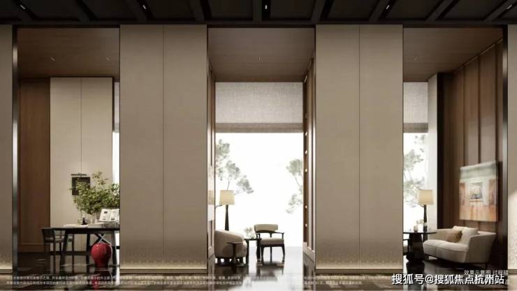 采用米黄色温润石材,巧妙模拟风的流畅形态,营造出既庄重又舒适的归家氛围。这片宽广的流线型石墙在柔和灯光的映衬下,更显璀璨夺目,而风雨连廊的灯带设计,更添一份尊贵仪式感。