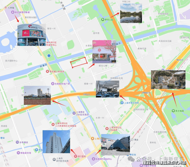 网上有人说这块地是闵行区污水处理厂拆迁而来,其实并不准确。闵行区污水处理厂在淀浦河与北横泾的交汇处,在这个项目以西约200米左右。项目地块这块地从90年代至今曾历经报春菜场、京代会所、小田园饭店、全季酒店、聚鑫阁饭店等。