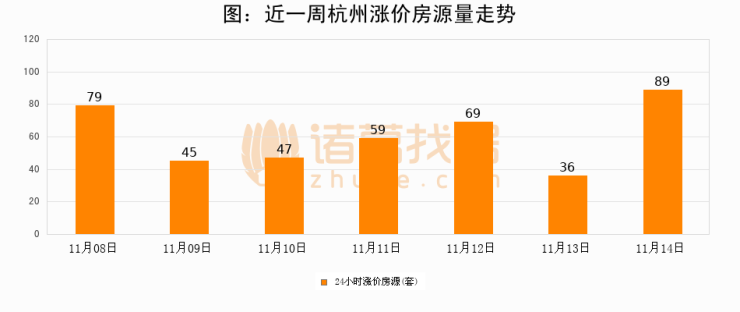 根据诸葛找房数据显示,杭州24小时涨价房源量为89套,较11月13日增加53套,环比上涨147.2%。与此同时,涨价房源占比小幅扩大,业主信心有所提升。