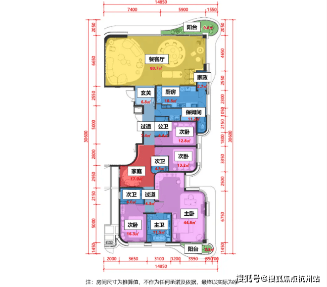 在功能空间的尺度上,整个客餐厅面积达到了约36.5㎡,主卧套房则拥有约28㎡大空间,足以媲美市面上建面约240㎡的产品。(该处面积为测算的净使用面积)