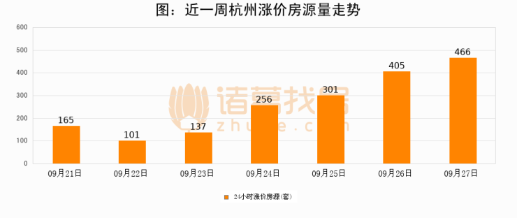 根据诸葛找房数据显示,杭州24小时涨价房源量为466套,较09月26日增加61套,环比上涨15.1%。与此同时,涨价房源占比小幅扩大,业主信心有所提升。