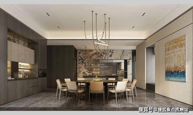 The living room is decorated with artistic paint and solid wood veneer. Natural stone is used as the background wall (only the 235㎡ unit uses natural stone), and the floor is paved with rock plates. The luxurious feeling is simply overwhelming the screen!