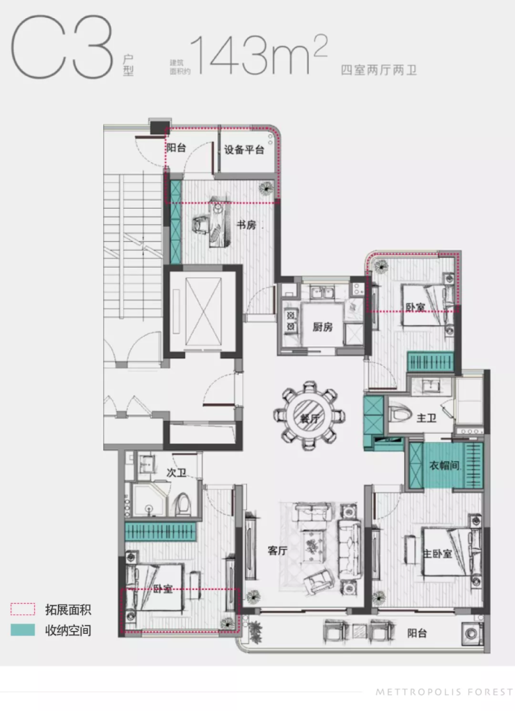 深入探索生活的尺度感和舒适感,都会森林精研户型设计和布局,建面约143㎡拥有约17㎡可拓展空间,将更多实用面积赋予居者,从而创造出更为宽敞的居住体验,让每个家人都能享受无处不在的宽绰与自在。