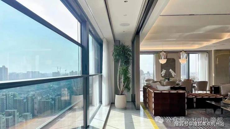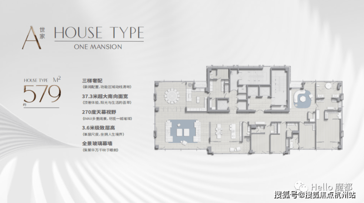 户型奢阔:采用一层一户设计,大平层户型,单层层高 3.6 米,搭配无梁楼盖结构,579㎡户型南向面宽达 35 米,且两款户型均配备 270 度全景落地窗,能尽享城市景观。