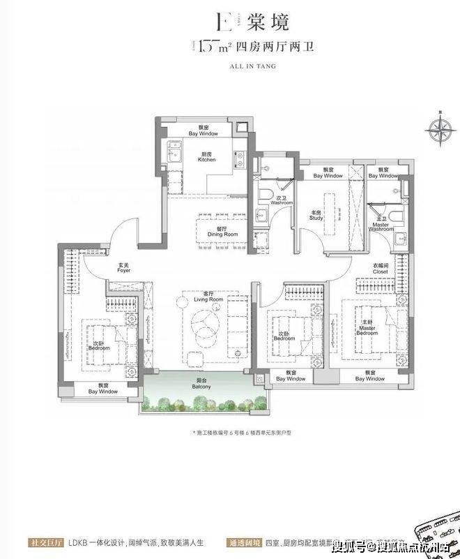 建面约105㎡3房2厅2卫,做到了三开间朝南4个飘窗+双面阳台系统+主卧套房设计+270°转角飘窗,该户型的居住体验、舒适度、尺度感,是同级别产品所无法比拟的。