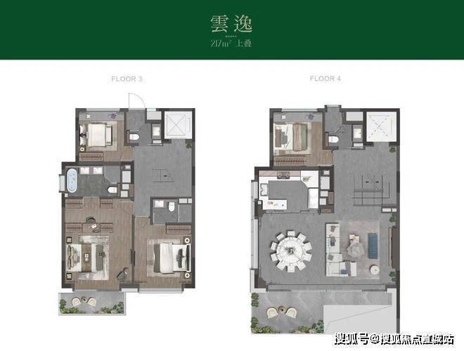 先看3-4层的主体空间。和其他常规上叠3层会客厅+4层起居室不同,项目将会客空间放在了4层,这是为了和顶层露台会客聚会功能整合在一起,形成更加合理的动线。