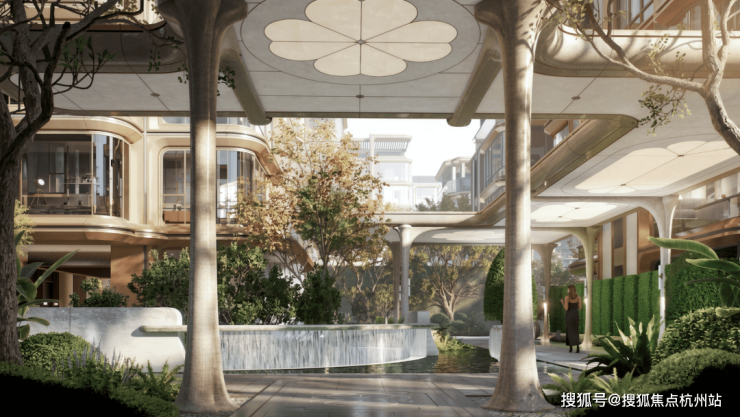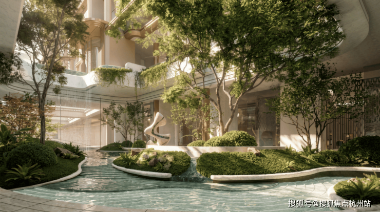 项目在抬板设计之余,还利用抬升形成的台地空间,来打造下沉式庭院,通过叠水、绿植的搭配,形成立体景观,这种一步一景的沉浸式森系园林,进一步体现项目自身森系园林景观。