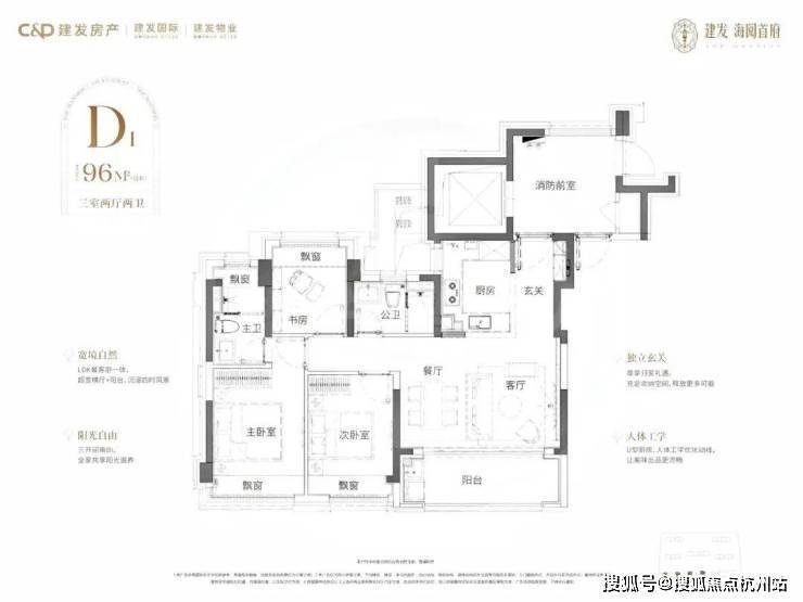 建面约103㎡3房户型:比起市面上普遍的三开间朝南动静分区户型,建发·海阅首府该户型至少有3大爆点: