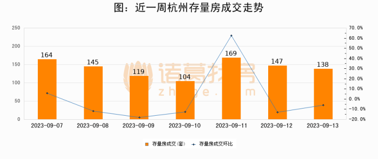 从存量房来看,2023年09月13日杭州存量房单日成交138套,比昨日减少9套,环比下降6.1%。从近一周存量房成交来看,杭州存量房日均成交套数为140套,09月13日单日成交138套,低于近一周平均水平1.4%。