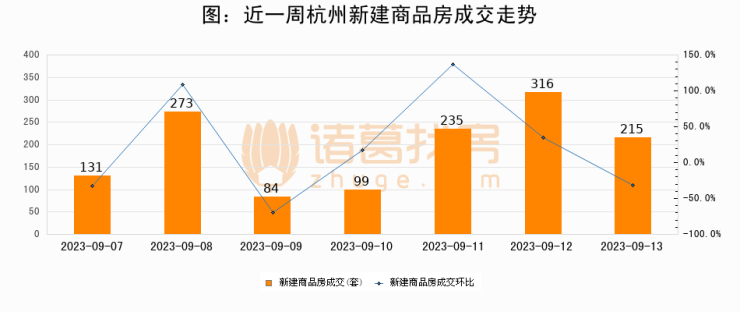 根据杭州市住房保障和房产管理局数据显示,2023年09月13日杭州新建商品房成交215套,较昨日减少101套,环比下降32%。近一周杭州新建商品房日均成交194套。09月13日单日成交215套,高于近一周平均水平10.8%。