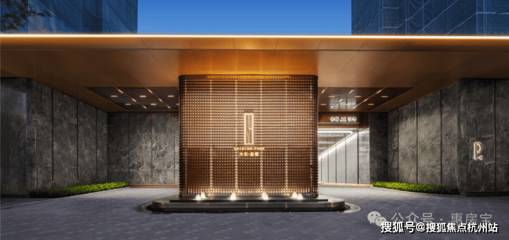 地上大堂,单元门厅的雨棚采用香槟金的 弧面铝板、立面 干挂爱马仕灰蜂窝岩板,岩板上嵌入专属楼栋号,单元门两侧的弧线段金属采用定制模具加工。