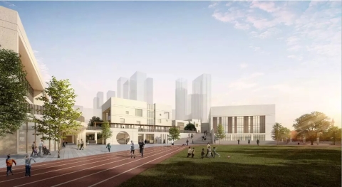 江南学校采用屋顶操场设计,将小学部与初中部分割开来,其底部为风雨操场及容纳600人的综合汇报厅,同时在场地北侧设置综合行政楼以增加从机场路高架方向的整体层次感。