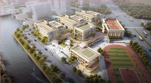 另一所位于亚运村运动员村2号地块内,总建筑面积36526平方米,其中地上面积20948平方米,地下面积15577平方米,规模为24个班。学校规划有教学楼、综合楼、风雨操场、共享空间、行政楼、室外操场等硬件配套设施,配备有底层架空的交流场所,复合多样的校园空间、泛生态化校园景观,通过对传统空间的传承、传统形式的建构、传统文化的植入来营造“融为境,融而有序”的传统院落空间。