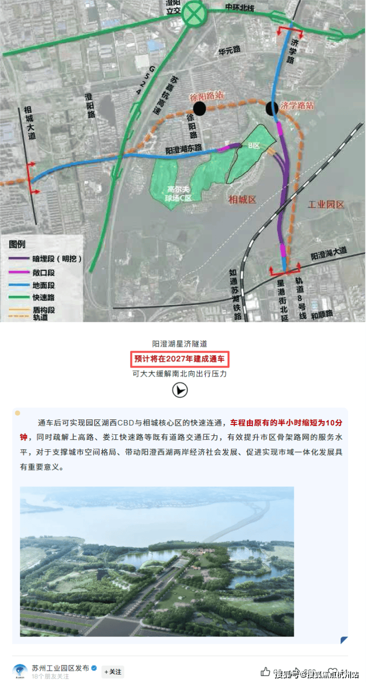 正在建设的星济隧道,未来约8分钟就能直达苏州中心。通过阳澄西湖南隧道,约3分钟到青剑湖,约20分钟可达湖东。步行约800米就是地铁8号线古香圩站,坐4站到苏州中心,6站到园区时代广场。这种 双隧道加地铁 的配置,让 熙和雲启观棠 的交通优势非常突出。