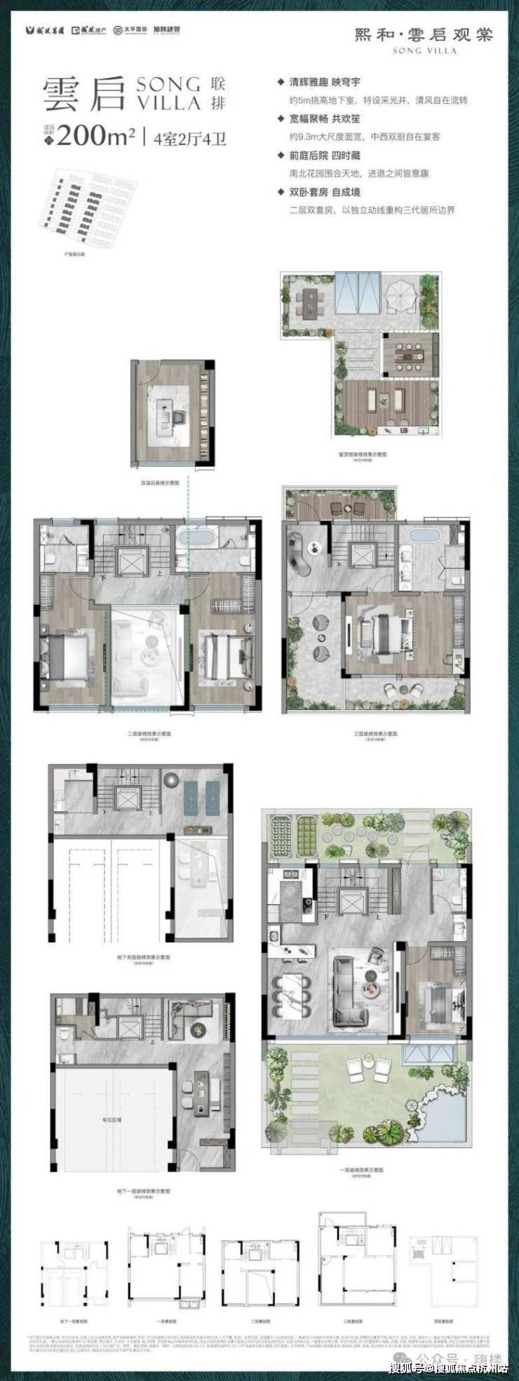 叠墅产品(4层真叠墅): 下叠(约160㎡): 可做4房3卫,面宽约7.4米。赠送客厅挑高、围合式的C型院落以及地下空间,私密性与趣味性兼得。